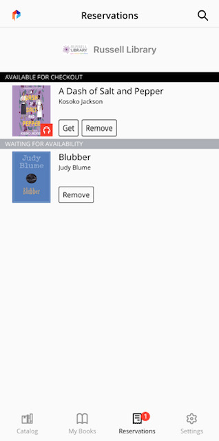 This category is where you can see the items you have on hold. You can check out the titles from here once they are available by pressing the “Get” icon. To remove a hold, simply press the “Remove” icon. The image below is what your Reservations tab will look like. As you can see, one audiobook I have on hold is ready to be checked out, so it comes up as “Get” under “Available for Checkout.” The other title is still unavailable, so it remains under “Waiting for Availability.”