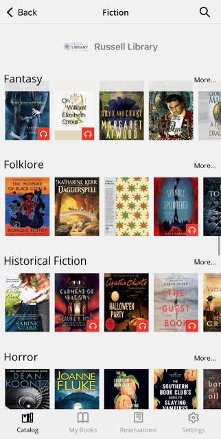 Once you download the app, you will have to swipe left through a few Palace graphics explaining the three steps to take to get started on the app. You don’t need to pay close attention to those because you’ve got all the info you need here! After you swipe through the graphics, you will be prompted to select your library. Russell Library patrons will select “The Russell Library.” If you are from another town or city, you can still use the Palace app under your home library. Simply search for it after downloading the app. If you happen to belong to multiple libraries, you can include multiple library cards on the Palace app.