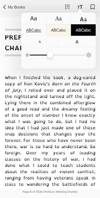 Under “My Books” you may select the “Read” icon to begin reading the books you have borrowed. Once you open the book, you may swipe left to go through each page. In the upper right hand corner, you can modify the font, screen mode (light, off white, or dark), screen brightness, and font size.