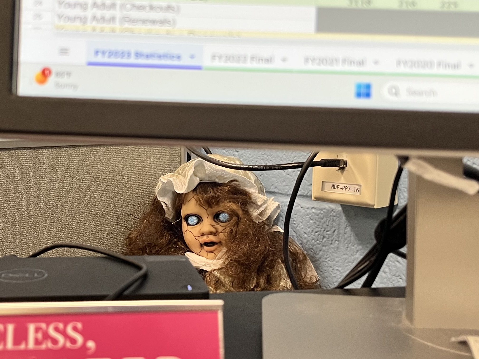 I try not to think about that dark, empty room that sits behind my desk’s wall. I also try not to think about the odd coincidence of Lil’ Deb starting to move around my office around the same time of the Secret Room’s discovery. Lil’ Deb, in case you did not meet her on last year’s Secrets of Russell Library’s tours, is a doll . . . or a demon. We’re not quite sure which.