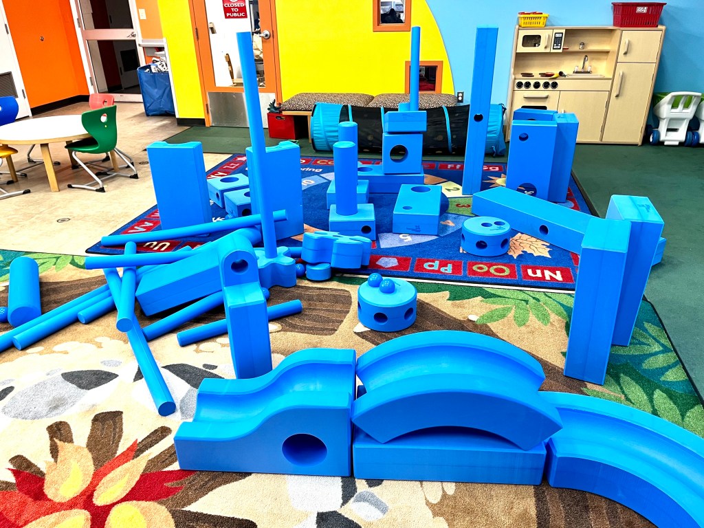 With the help of our Facilities department, we dismantled the big tables and replaced them with foldable tables on wheels that we bring out as needed. We relocated the big campfire rug out from under the train table in the Virginia Hatch Room and placed it over the newly exposed floor tiles. The rugs protect little ones from bumps and bruises. We also purchased new green leaf rugs. Now we have a large, rug-covered area where kids can play with all the new toys.