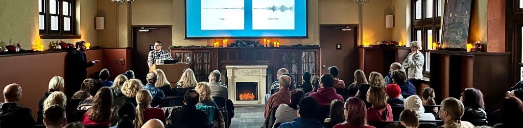On December 9th, the Eastern Connecticut Paranormal Society (ECPS) presented on their findings from two investigations in 2023 at Russell Library. When we looked at our respective calendars in the fall, we found that early December was the soonest available date for their visit. I initially thought that we should schedule the event for later next year, closer to the Halloween 2024 season, instead of during the cheerful holiday season. However, my librarian colleagues quickly pointed out that ghosts and the holidays go really well together. I had never thought about that before, but clearly they were right. When ECPS presented, so many folks came to the Hubbard Room that some of us had to stand to listen. My colleagues had decorated the Hubbard Room in full holiday regalia, complete with glowing fireplace, evergreen boughs, and candles. Somehow, the mix of holiday decor and eerie findings struck exactly the right note.