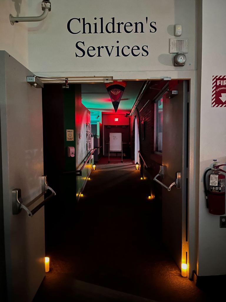 As the Head of the Youth and Family Learning Department, I thought I’d start with the Virginia Hatch Room. Also known as the Picture Book Room, the Virginia Hatch Room was built in 1983 as part of the bridge between the Old Church and the Old Bank. It has beautiful two-story tall windows overlooking the Courtyard, and a stained glass window from the Old Church that was relocated during renovations. The front of the room opens up onto the juvenile non-fiction stacks and current Youth & Family Learning public service desk. The back of the room ends in a wall with high windows and a long staircase going up to the Hubbard Room with two doors for access.