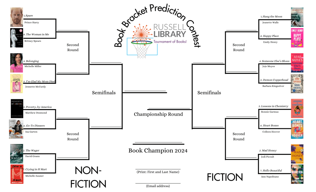 In the spirit of a little springtime competition, we’re bringing bracket-fever to Russell Library in our inaugural Tournament of Books, where you can vote on the top books read last year to help determine the Book Champion of 2024! We’ve taken 16 of our most checked-out books and put them into a knockout-style bracket, where you’ll vote in head-to-head matchups until only one remains.