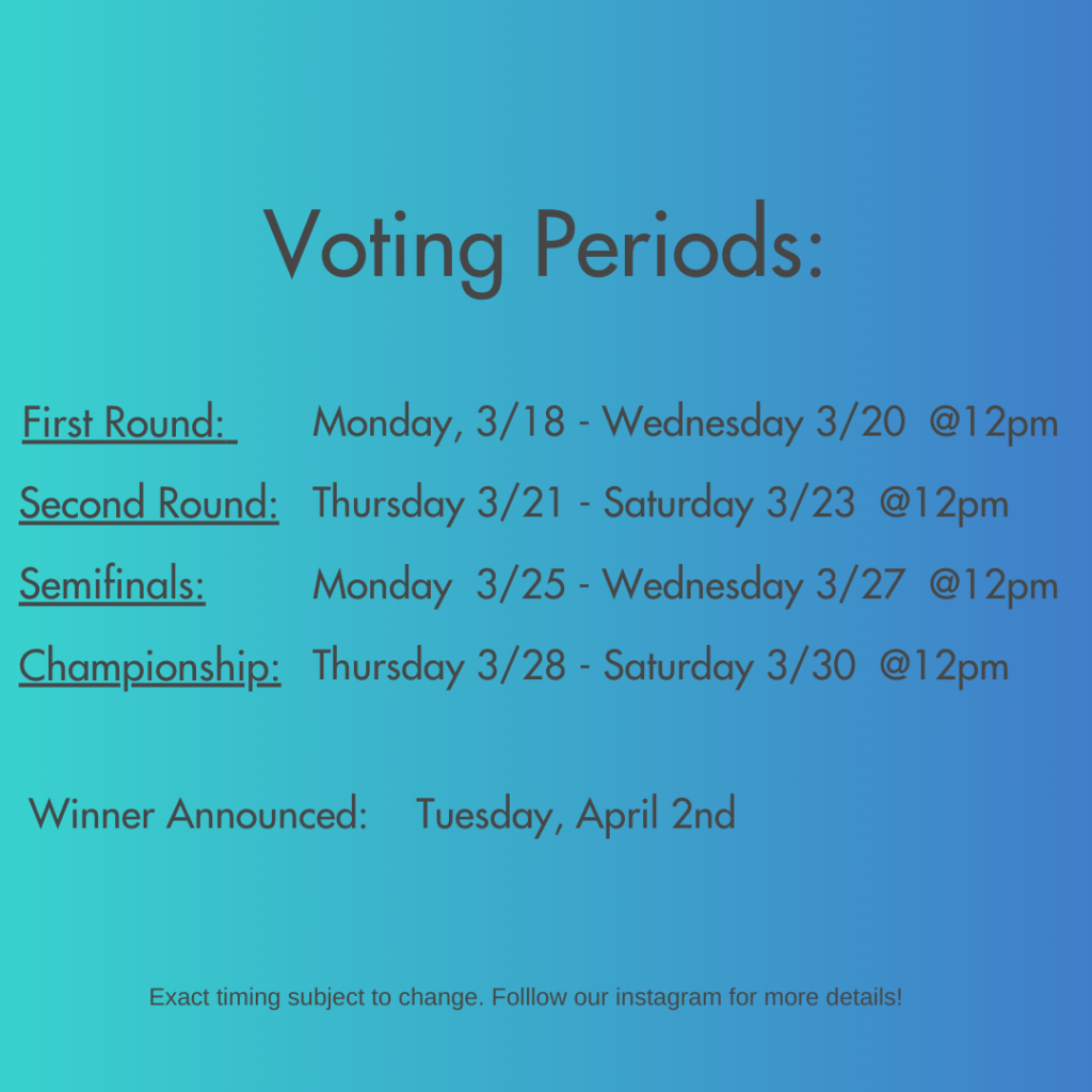 Once bracket prediction submissions close, voting for the first round will begin on Monday, March 18th! There are four rounds of voting, so each will only last a few days. Voting can be done in-person or online. You’ll definitely want to follow us on our Instagram (@russelllibrarymiddletown), where we’ll post the link to online voting form for each round. The link for each round of online voting will also be available on the Russell Library homepage when voting is live.