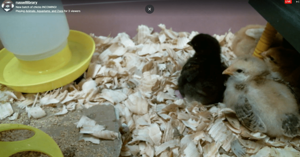 Can’t make it to the library? Or just can’t miss any moment of the hatching or the chicks? No problem. As soon as the eggs arrive, our Department of Emerging Technology sets up a 24/7 “Peep Show” (aka web cam) on the incubator. As long as the chicks are with us, the link is right at the top of our homepage: russelllibrary.org.