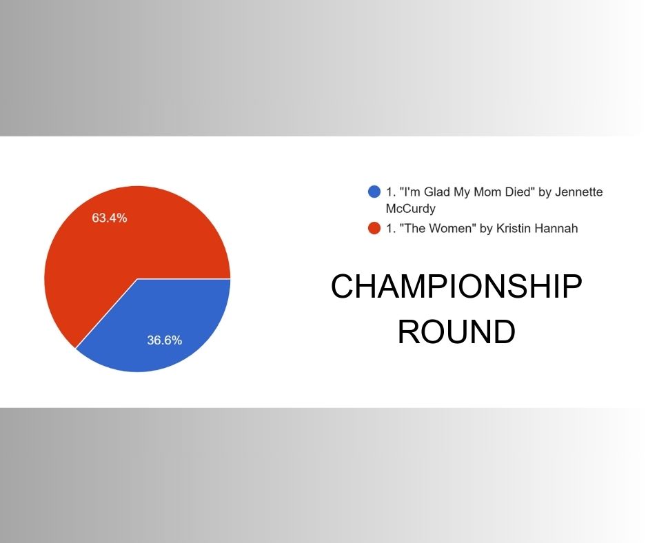 In the championship round, Jennette McCurdy’s memoir was outmatched, though not outclassed. This year, The Women won with 63% of the vote. To me, this was an admirable redemption run for I’m Glad My Mom Died, which failed to make it out of the top 8 last year.