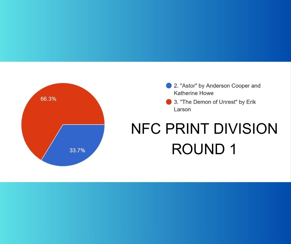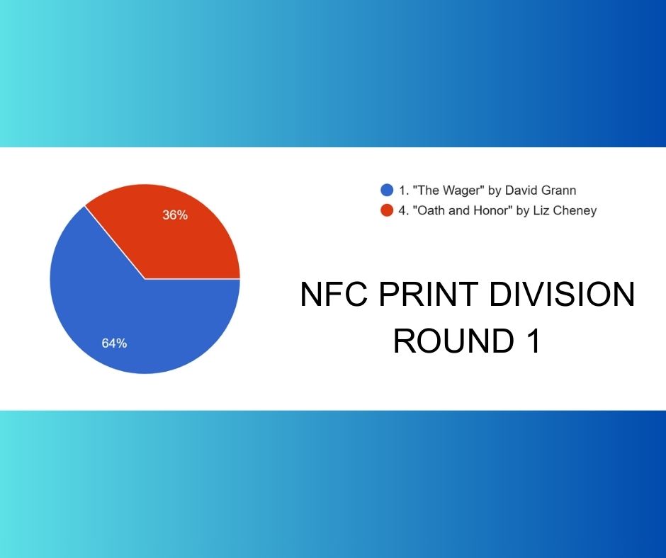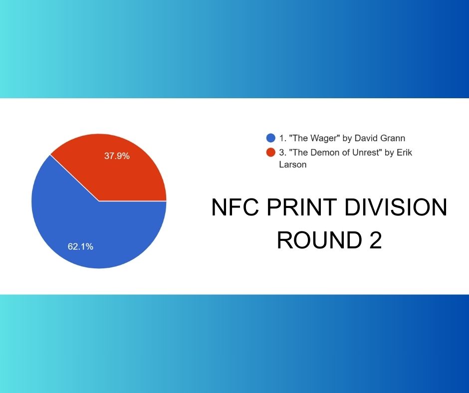 The first round of the NFC Print division offered decisive victories for The Wager and The Demon of Unrest by Erik Larson, which recounts the five month period between the election of Abraham Lincoln and the start of the American Civil War. When they met in the second round, The Wager would prevail, securing it’s spot in the Formidable Four.