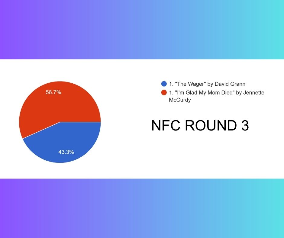 Remarkably Bright Creatures put up an admirable fight, garnering 43% of the vote, the largest vote share of any book to face off against The Women this year. Similarly, a somewhat-close decision in the NFC saw The Wager‘s journey coming to end.