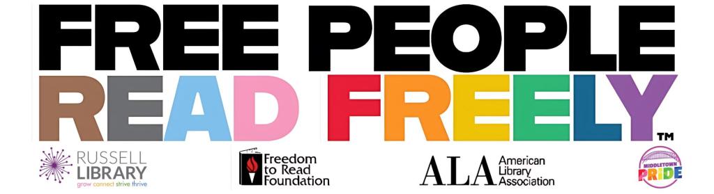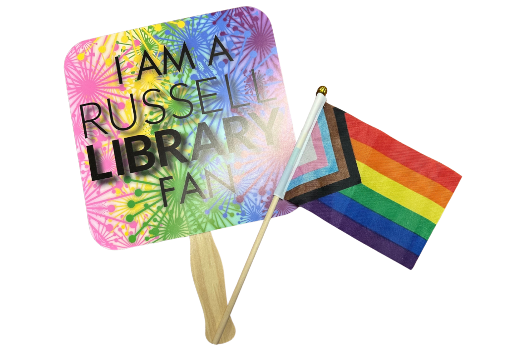 A Russell Library contingent will march at 1pm and host a booth at PrideFEST thereafter. We’re rallying around the concept that Free People Read Freely, a slogan which resonates at this moment due to the number of LGBTQIA2S+ titles that have been challenged across the country. You’re welcome to march with us by registering online – registered volunteers get a free multi-color Russell Library t-shirt to wear on June 1. At our booth you can score the Free People Read Freely bumper sticker featured at the top of this page plus a Progress Pride Flag and an “I’m a Russell Library fan” hand fan to cool yourself off in the warm summer sun *while supplies last.*