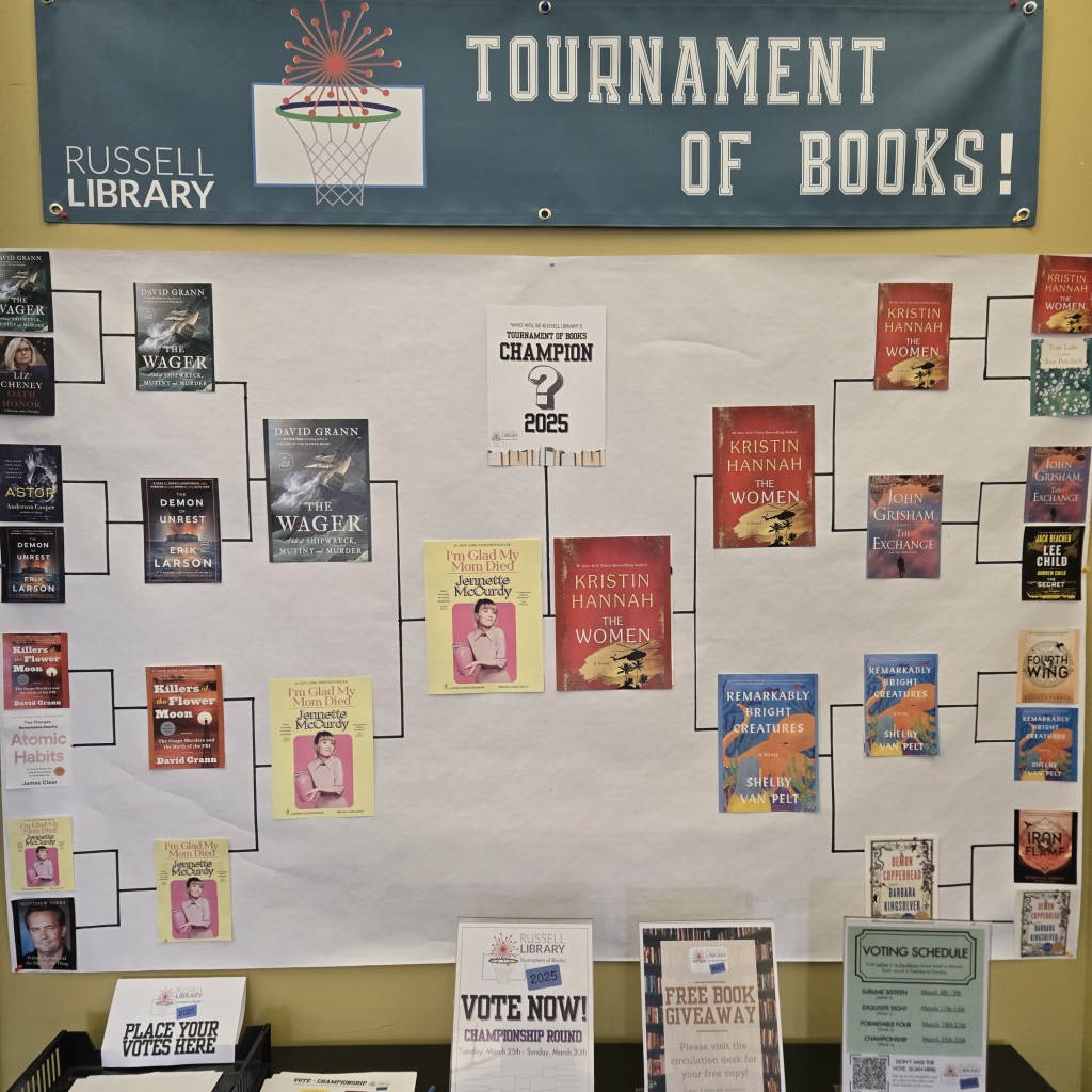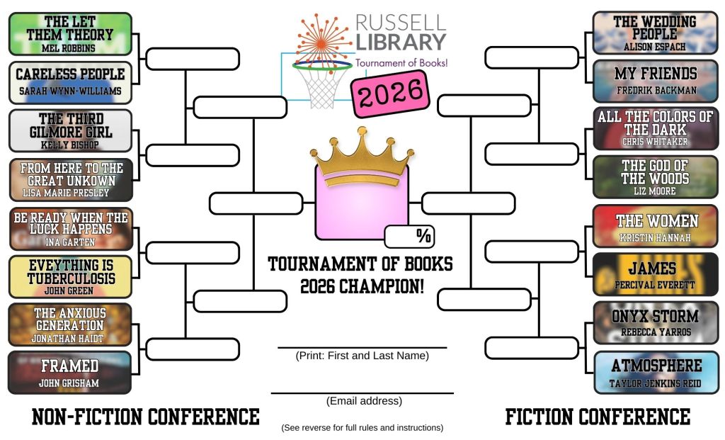 March is on the horizon, and at Russell Library that can only mean one thing — the Tournament of Books has returned! Make a bracket, vote for your favorite books, and help decide the 2026 Tournament of Books Champion!
