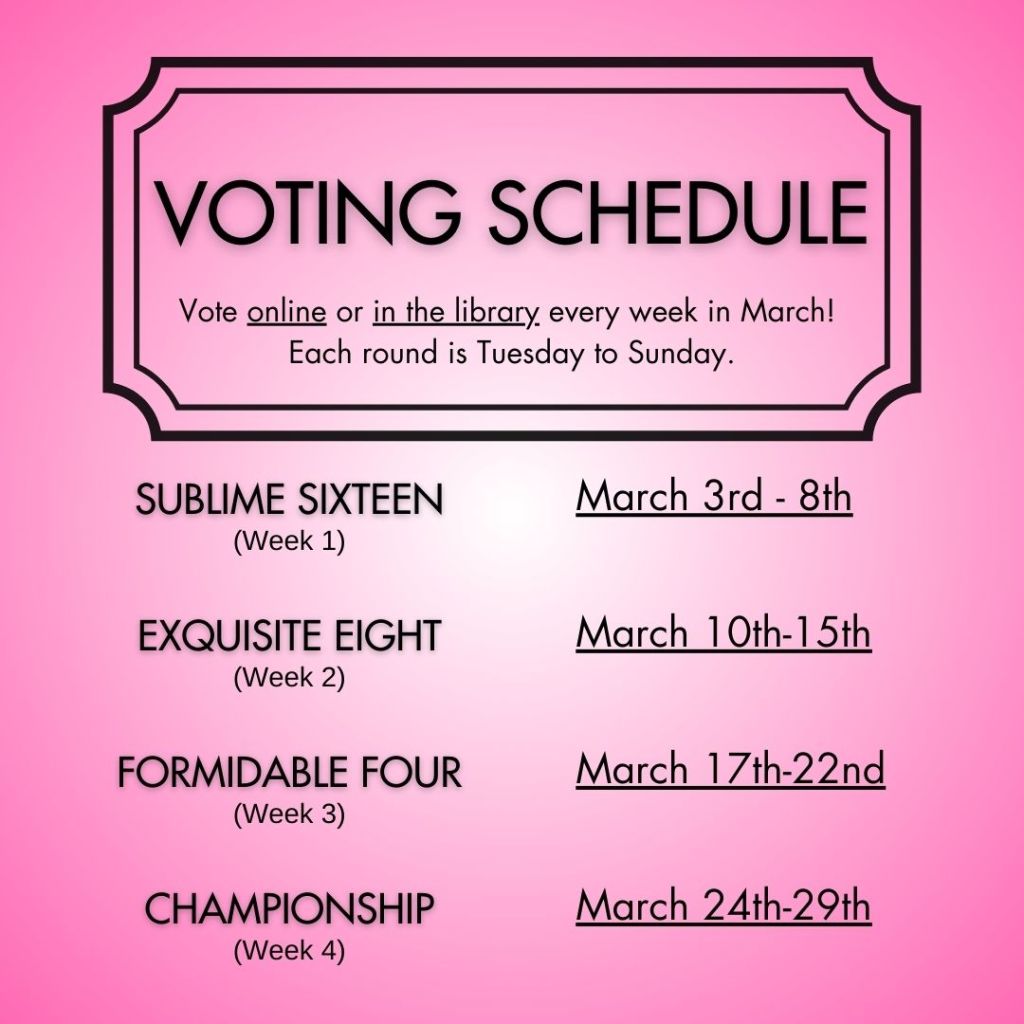 You’ll definitely want to subscribe to the newsletter for a link to voting every Tuesday morning in March. Alternatively, cast a vote when you stop into the Library!