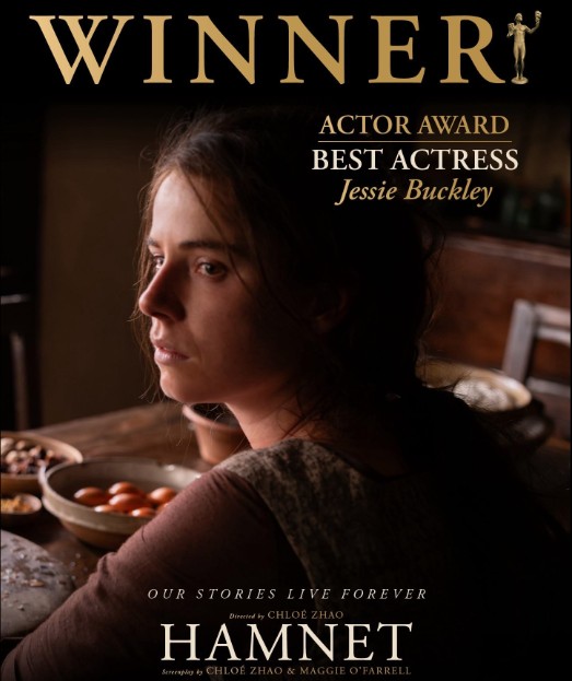 Jessie Buckley won Best Actress by playing the grieving mother of the title character, Hamnet or Hamlet. Hamnet was also nominated for Best Picture, Best Director, Best Adapted Screenplay, Best Casting, Best Production Design, and Best Costume Design.